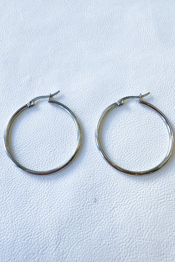 Αποκτήστε μια εντυπωσιακή εμφάνιση με αυτά τα μεγάλα ατσάλινα σκουλαρίκια κρίκοι σε ασημί απόχρωση. Με εντυπωσιακή διάμετρο 7,3 εκ., αυτο...