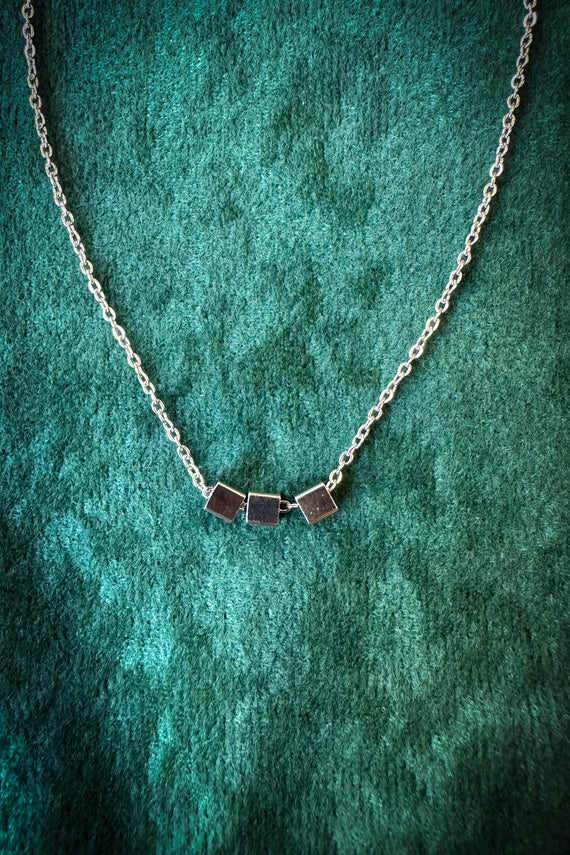 Εντυπωσιακό και minimal κολιέ από ανοξείδωτο ατσάλι σε ασημί απόχρωση, με τρία διακριτικά κυβάκια που προσδίδουν μοντέρνα αισθητική. Το μ...