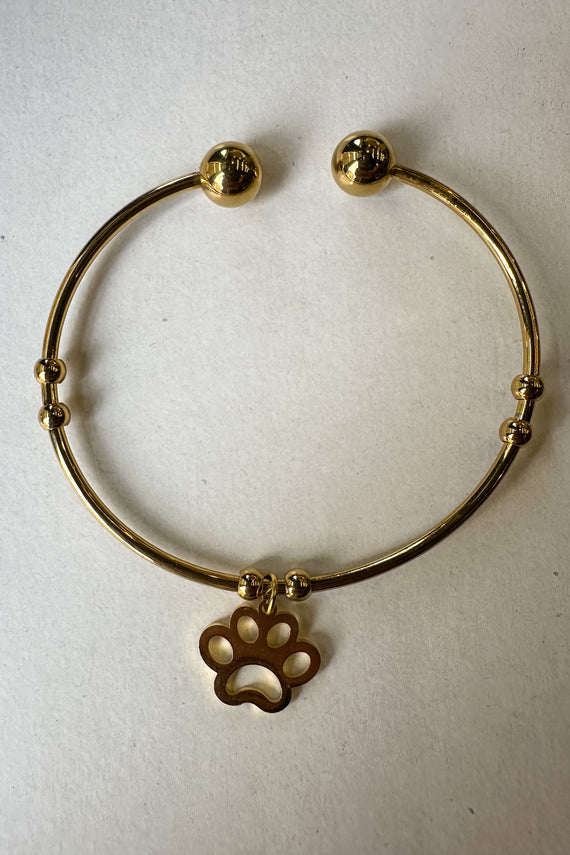 Μια κομψή και παιχνιδιάρικη ατσάλινη χρυσή χειροπέδα, ειδικά σχεδιασμένη για τους λάτρεις των σκύλων! Διαθέτει μια μικρή, χαριτωμένη πατούσα σκύλου που δίνει έναν ιδιαίτερο χαρακτήρα στο κόσμημα. Κατασκευασμένη από υψηλής ποιότητας ατσάλι, είναι ανθεκτική και διατηρεί τη λάμψη της για μεγάλο διάστημα χωρίς να μαυρίζει. Το ευέλικτο, ανοιχτό σχέδιο της χειροπέδας εξασφαλίζει εύκολη εφαρμογή και άνεση.